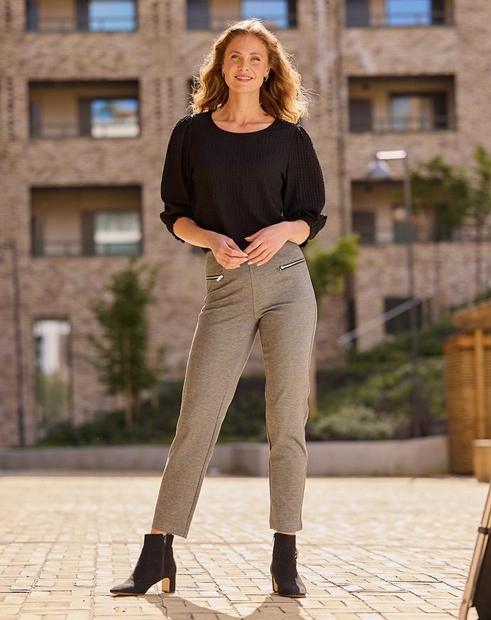Smale bukser: Modellen har på seg vår populære Nova bukse i sort/grått mønster. Flott for å framheve ben, og til å style med støvletter og boots.