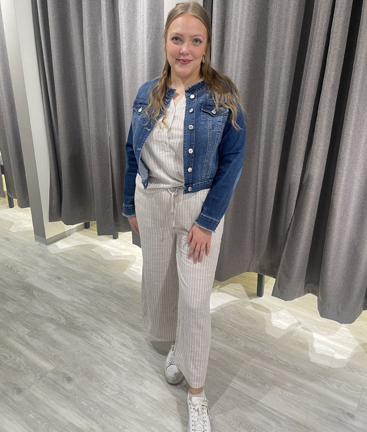 Bare se her sier Lotte og svinger inn i prøverommet og kommer ut med dette kule lin/viskose settet – her bruker jeg den samme tøffe denimjakken som jeg ville brukt til kjolen. Denimjakke er et utrolig anvendelig plagg – passer til nesten alt. Vi har to ulike modeller - en med og en uten krage. Her er det smak og behag som styrer valget.