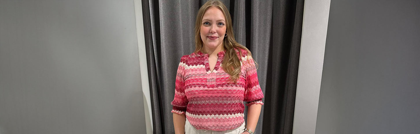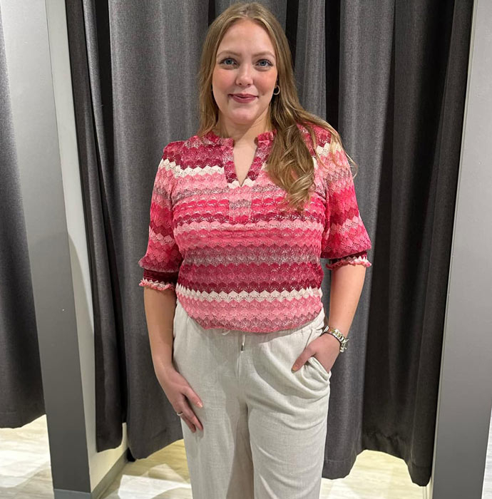 Her er det noe for enhver smak, og hele fargepaletten er representert. Liker du duse eller sterke farger? Vi har utvalget. Lotte tar på seg en sandfarget bukse og styler den med en mønstret topp i sterke farger – veldig fresh synes vi. Denne kan jeg kjapt style med en ensfarget topp og en dressjakke – så har jeg plutselig et helt annet uttrykk. Jeg liker å ha gode baseplagg i garderoben, og krydre med topper og bluser i glade farger. Da har jeg et godt utgangspunkt for å sette sammen mange antrekk, og det liker jeg.