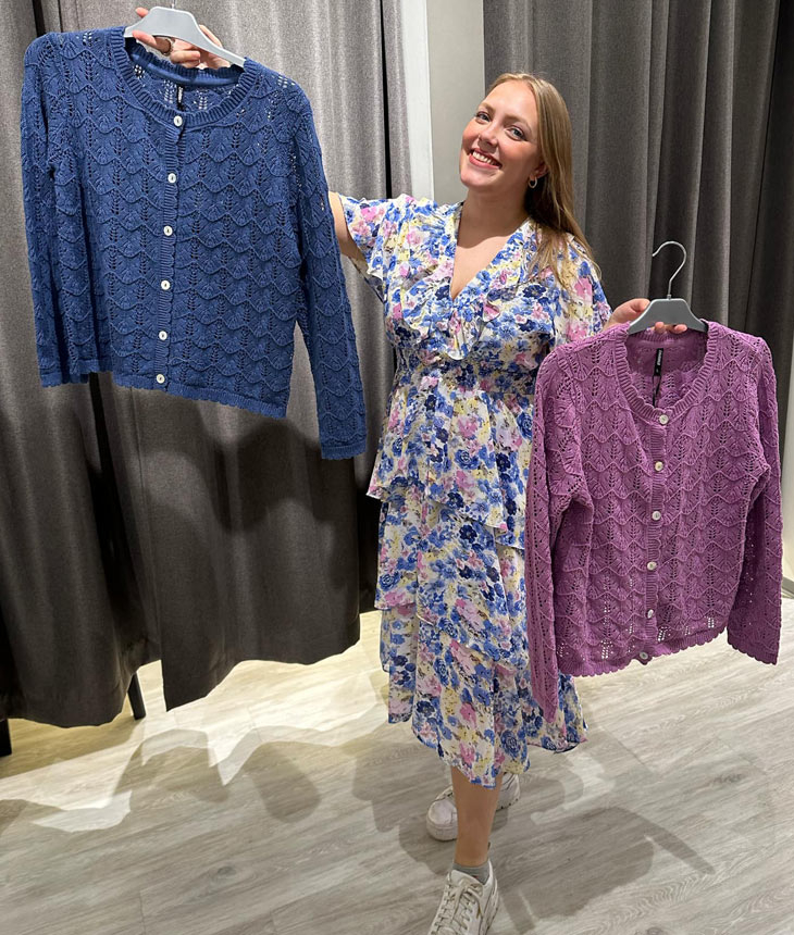 Lotte liker å snakke om klær og viser oss villig rundt. Har du funnet noen favoritter spør vi, og Lotte viser fram en blomstret kjole hun kommer til å bruke ofte utover sommeren. Denne er super til mye – alt fra lunsj med venninner til middag med vennegjengen. Til denne kan du velge en blå eller plommefarget jakke, alt etter hva du liker – jeg kommer nok til å bruke en tøff denimjakke til om jeg skal på en venninnelunsj. Jeg elsker plagg som kan brukes til mange anledninger.